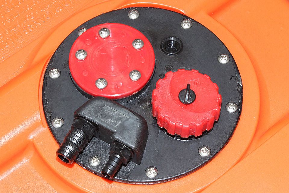Заливная горловина с резьбовой крышкой. Два патрубка под шланги отбора топлива и вентиляции. Предусмотрена возможность установки датчика уровня топлива (приобретается отдельно). Инспекционный лючок для осмотра и очистки внутренней полости бака.