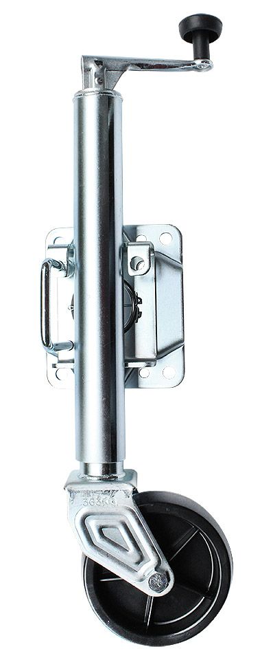 Опора с колесом для трейлера, с крепежным кронштейном (381 мм) регулируемая по высоте (в пределах 250 мм) опора для дышла трейлера. Грузоподъемность - 360 кг.