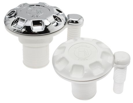 Палубная горловина, объединенная с вентиляционным патрубком. Надпись "fuel" (топливо) на крышке. Патрубок под топливный шланг с внутренним диаметром 38 мм. Вентиляционный патрубок под шланг с внутренним диаметром 19-20 мм. Два варианта: белая и хромированная.