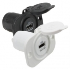 Гнездо питания с одним USB гнездом (5 B, 2,4А) и крышкой для защиты от попадания влаги. Зарядный ток (2,4 А) достаточен как для зарядки смартфонов, так и более мощных потребителей (планшетов и т.п.) Светодиодный индикатор включения. Напряжение питания: 12 В (бортовая сеть). Монтажная панель съемная.