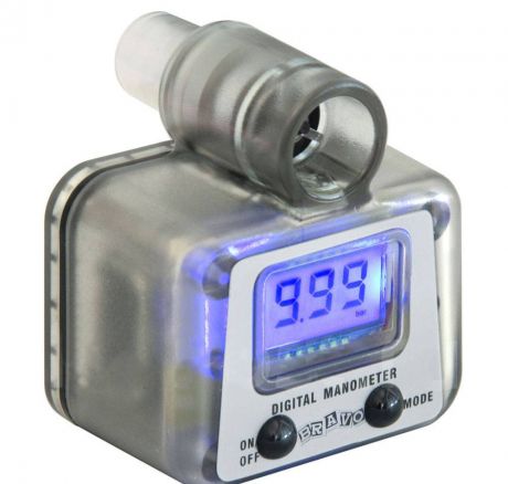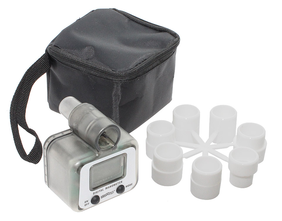 Цифровой манометр с подсвечиваемым ЖК экраном. Возможность выбора единиц измерения (mbar – psi – Kpa – bar). Элемент питания (батарейка) в комплект поставки не входит и приобретается самостоятельно.