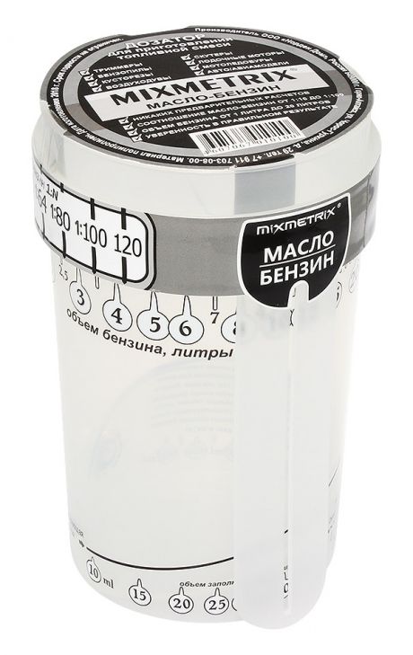 Универсальный дозатор, позволяющий легко и быстро отмерить количество масла, необходимое для приготовления топливной смеси. Позволяет приготовить заданное количество топливной смеси (от 1 до 20 литров) с различным содержанием масла (1:16, 1:20, 1:30, 1:50 и др.).