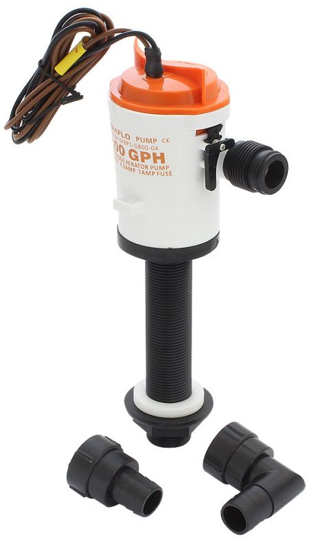 Помпа с двумя резьбовыми патрубками (стандартная дюймовая трубная резьба 3/4 дюйм + два сменных адаптера (прямой и угловой) под шланг с внутренним диаметром 19 мм). Заборный патрубок снабжен фиксирующей гайкой. Используется для подачи свежей забортной воды в садок с рыбой. Также может использоваться в качестве трюмной помпы.