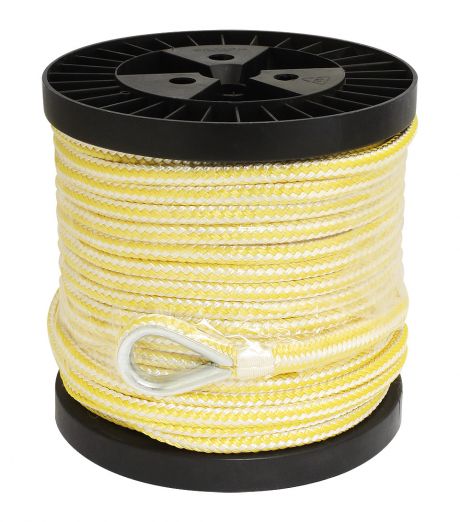 Готовый плетеный якорный конец. Имеет заделанный фабричным способом огон с коушем. Изготовлен из качественного нейлона. Цвет белый с желтым. Различные длины и диаметры.