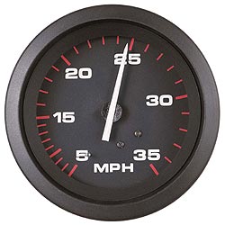 Двойная шкала мили/ч (узлы) – км/ч. Стойкое к царапинам выпуклое стекло. Черный циферблат с белыми цифрами, красными делениями и двойной подсветкой (периметр и цифры). Черная стрелка с оранжевым «носиком» и силиконовым демпфером, гасящим вибрацию и предотвращающим дрожание. Диапазон измерений: 0-65 mph/0-75 knot (мили/узлы в час, вторая шкала в км/ч). Диаметр циферблата: 3 дюйма. Тип датчика: «G» (трубка Пито; входит в комплект, приобретается отдельно или, как правило, уже имеется на двигателе). Производитель: «Teleflex», США.