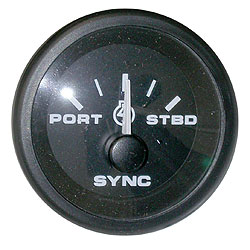 Индикатор синхронизации. Показывает разницу оборотов коленчатых валов двух двигателей (стрелка индикатора в соответствии с вариантом настройки отклоняется в сторону более «быстрого» либо более «медленного» двигателя). Стойкое к царапинам выпуклое стекло. Черный циферблат с белыми и синими цифрами. Стрелка с силиконовым демпфером, гасящим вибрацию и предотвращающим дрожание. Экранированная конструкция для защиты от электромагнитных помех.