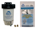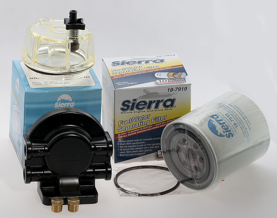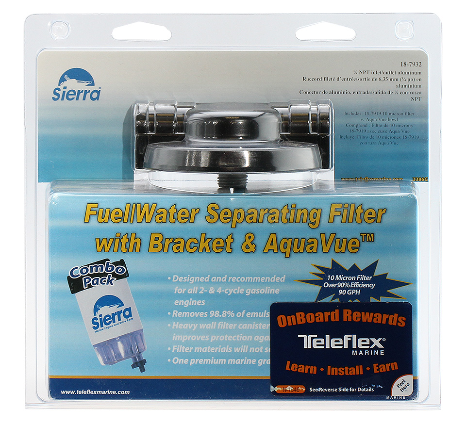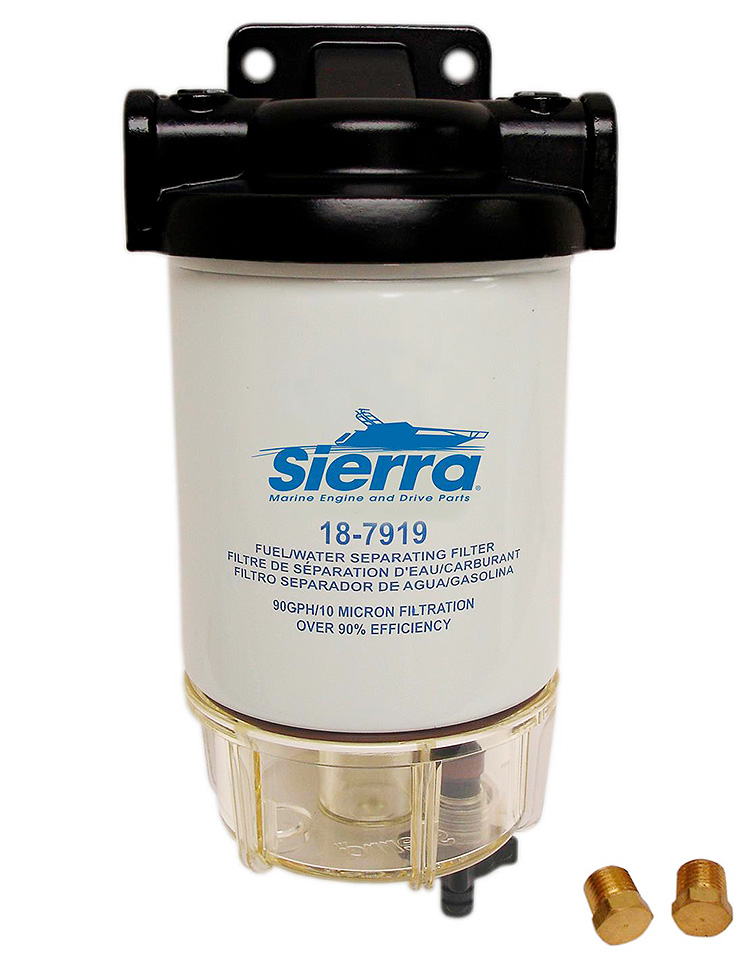 Фильтр топливный водоотделительный с отстойником, универсальный. Новый 10-микронный фильтр «Sierra» позволяет удалить до 90% механических загрязнений размером 10 микрон и более, а также до 98,8% влаги, присутствующей в топливе в виде эмульсии. Прозрачный отстойник со сливом продлевает ресурс картриджа и дает возможность визуально контролировать состояние фильтра. Высокая производительность позволяет рекомендовать этот фильтр для применения с самыми мощными бензиновыми подвесными и стационарными двигателями.
