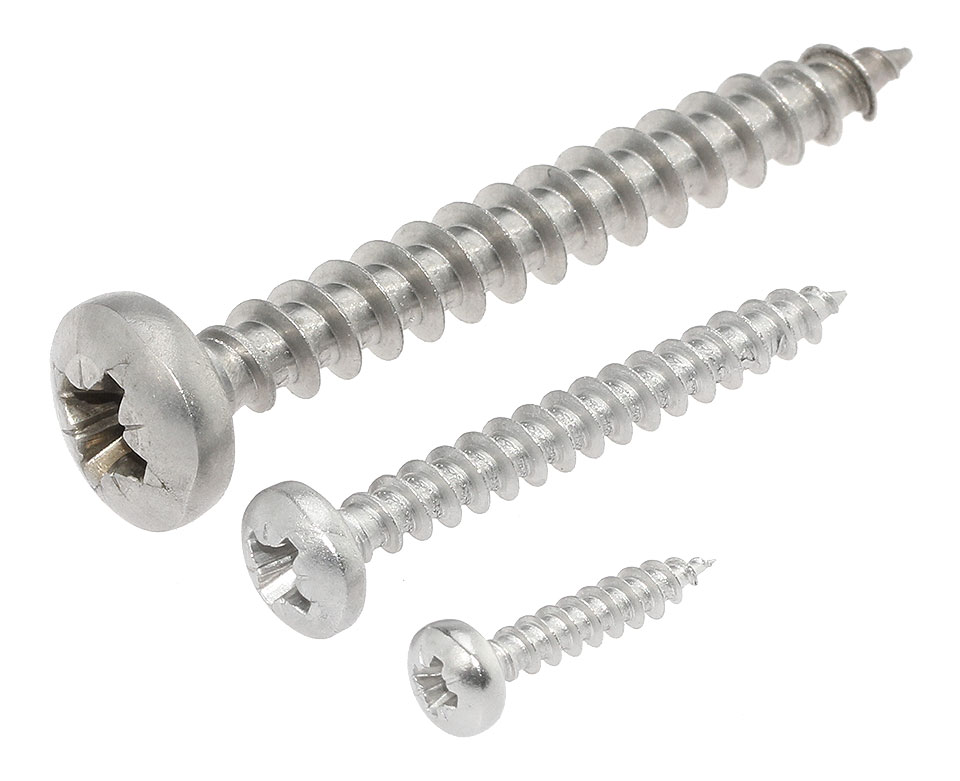 Самонарезающий винт из нержавеющей стали с плоской полукруглой головкой. Шлиц по крестовую отвертку (DIN 9048). Цифра после знака «Х» в маркировке — длина в мм, например 3,0?16 = винт диаметром 3 мм и длиной 16 мм.