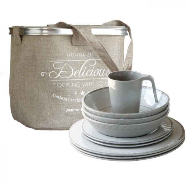 Набор посуды из меламина — стойкого к ударам и царапинам керамоподобного пластика. Большая тарелка, десертная тарелка, суповая миска, кружка  - все по 6 шт (всего 24 предмета в наборе). Набор поставляется в элегантной сумке, которая также может быть использована в хозяйственных целях. Цена за набор.