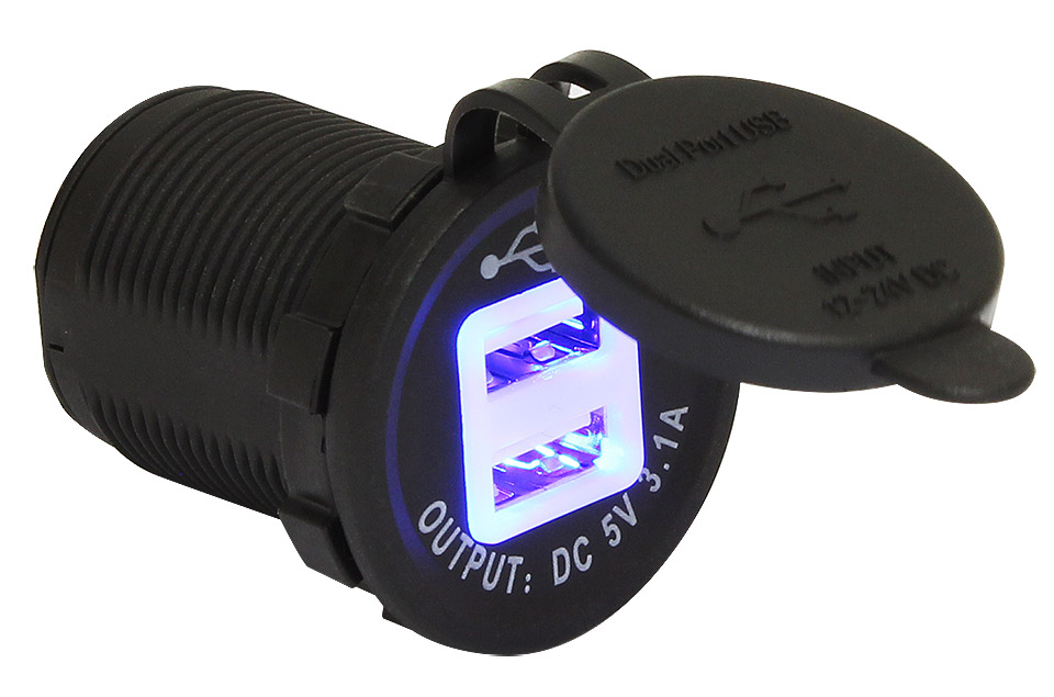 Светодиодная подсветка. Напряжение питания: 12/24 В (бортовая сеть). Максимальный зарядный ток (суммарно на оба гнезда) - 3,1А.