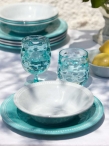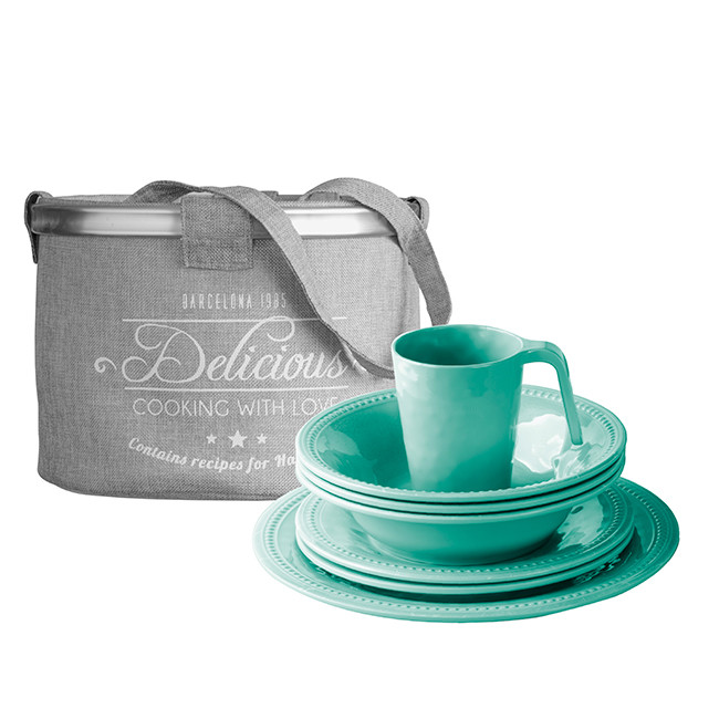 Набор посуды из меламина — стойкого к ударам и царапинам керамоподобного пластика. Большая тарелка, десертная тарелка, суповая миска, кружка - по 4 шт (всего 16 предметов в наборе). Поставляется в сумке-контейнере, которая может использоваться для хранения посуды или, например, как пляжная сумка. Цена за набор.
