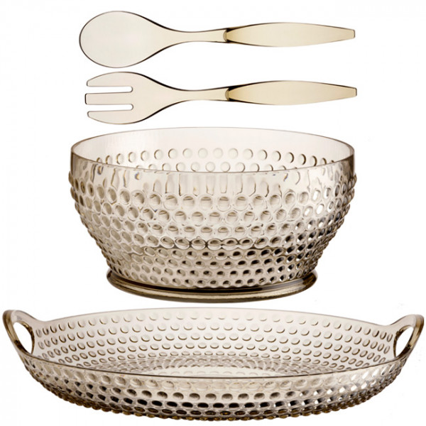 Поднос, миска, вилка и ложка для салата. Изготовлены из метилстиренового стекла (MS BPA Free — 60% Acrylic + 40% Polystyrene) - одного из наиболее стойких к ударам и царапинам материалов на рынке морской посуды. Четыре предмета в наборе. Цена за набор.