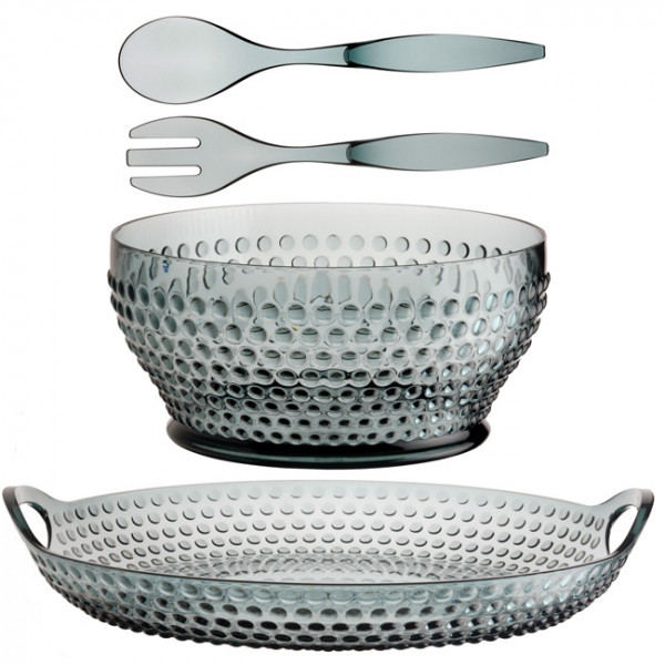 Поднос, миска, вилка и ложка для салата. Изготовлены из метилстиренового стекла (MS BPA Free — 60% Acrylic + 40% Polystyrene) - одного из наиболее стойких к ударам и царапинам материалов на рынке морской посуды. Четыре предмета в наборе. Цена за набор.