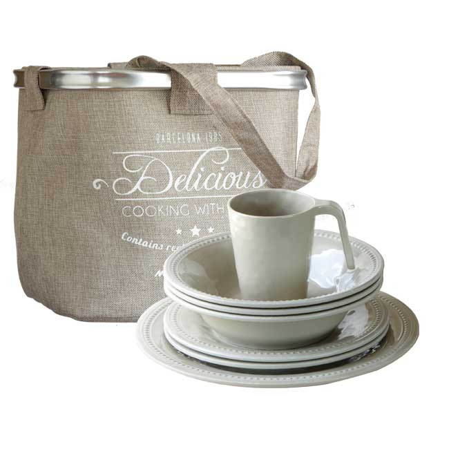Набор посуды из меламина - стойкого к ударам и царапинам керамоподобного пластика. Включает 6 больших плоских тарелок, 6 глубоких мисок, 6 десертных тарелок и 6 кружек. Упакован в стильную сумку, которая также может использоваться для походов на пляж или в магазин. 24 предмета в наборе, цена за набор.