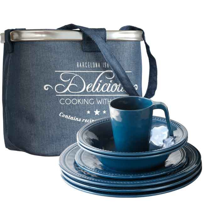 Набор посуды из меламина - стойкого к ударам и царапинам керамоподобного пластика. Включает 6 больших плоских тарелок, 6 глубоких мисок, 6 десертных тарелок и 6 кружек. Упакован в стильную сумку, которая также может использоваться для походов на пляж или в магазин. 24 предмета в наборе, цена за набор.