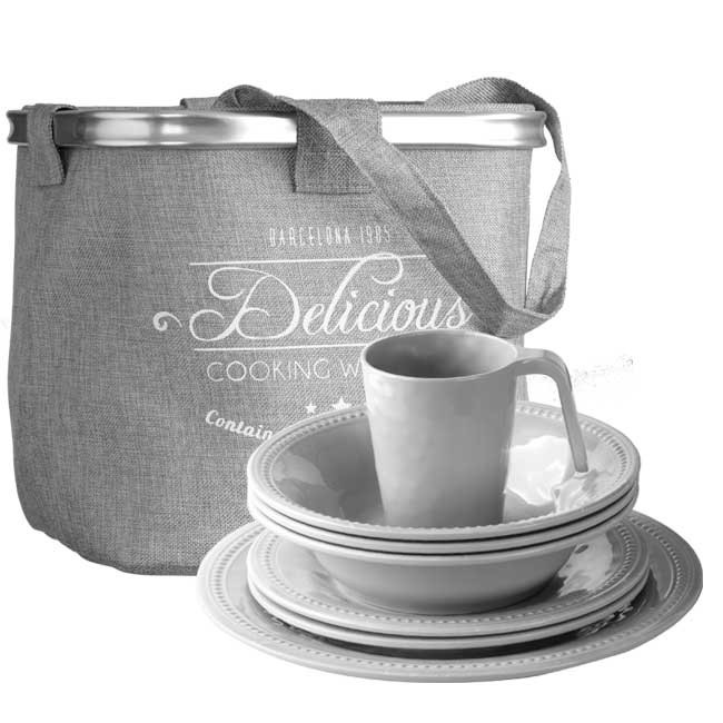 Набор посуды из меламина - стойкого к ударам и царапинам керамоподобного пластика. Включает 6 больших плоских тарелок, 6 глубоких мисок, 6 десертных тарелок и 6 кружек. Упакован в стильную сумку, которая также может использоваться для походов на пляж или в магазин. 24 предмета в наборе, цена за набор.