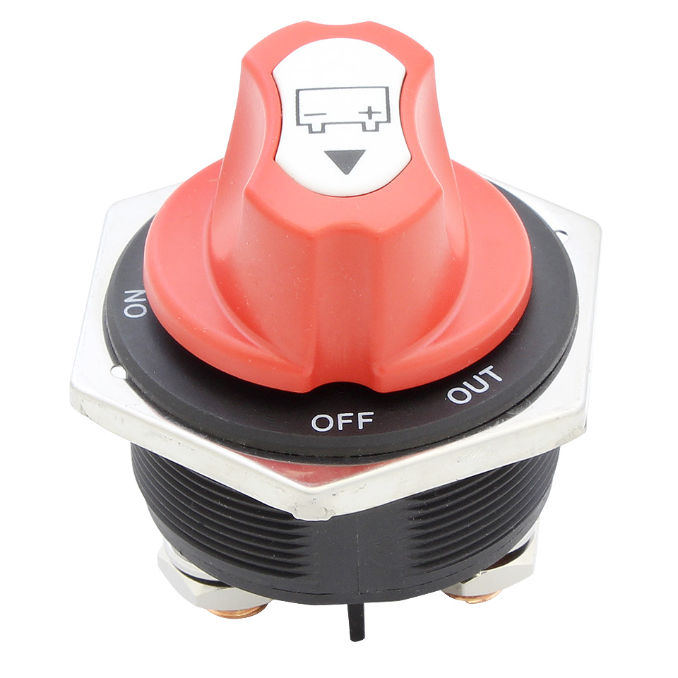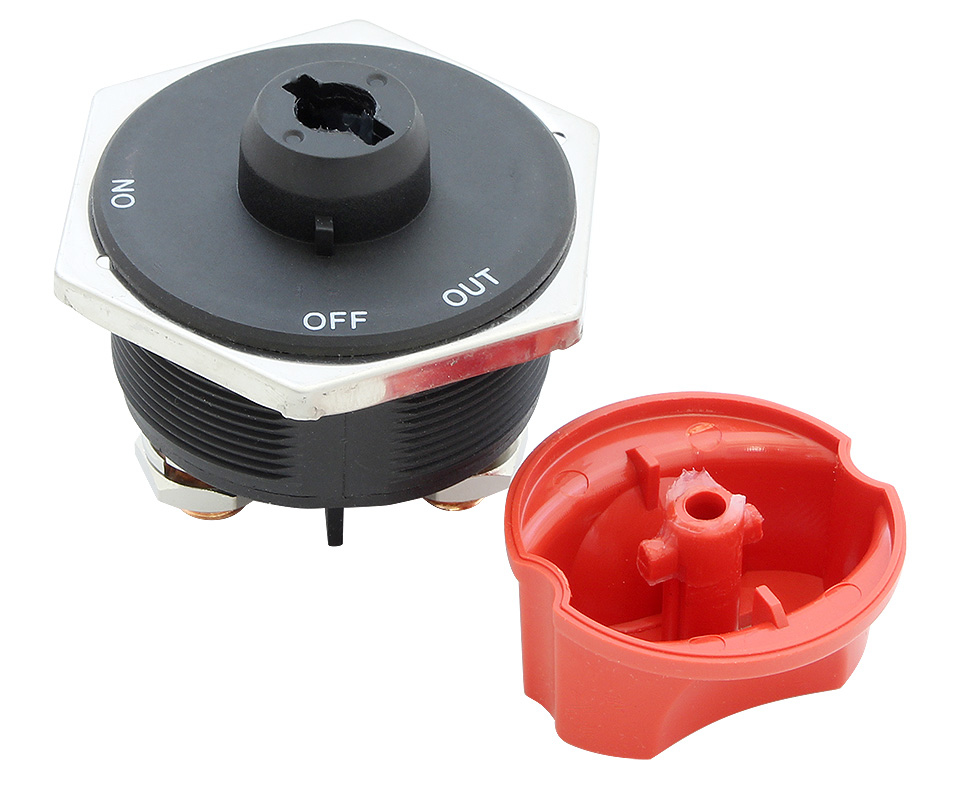 Компактный выключатель массы. Врезается в приборную панель или в переборку. Имеет съемную рукоятку, что позволяет использовать выключатель для предотвращения несанкционированного включения электропитания. Имеет три положения рукоятки: OFF (питание выключяно), ON (питание включено), OUT (в этом положении рукоятку можно снять с выключателя).