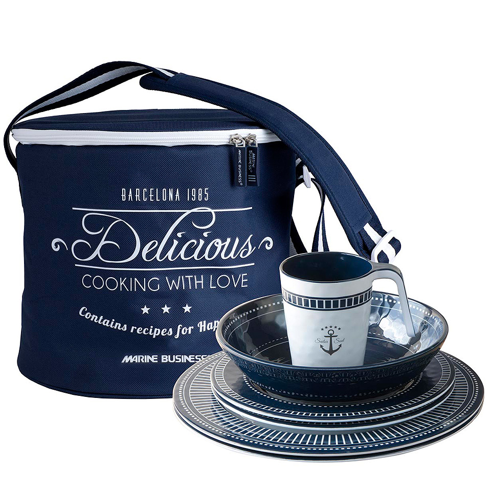 Набор посуды из меламина — стойкого к ударам и царапинам керамоподобного пластика. Большая тарелка, десертная тарелка, суповая миска, кружка - все по 4 шт (всего 16 предметов в наборе). Набор поставляется в элегантной сумке, которая также может быть использована в хозяйственных целях. Цена за набор.