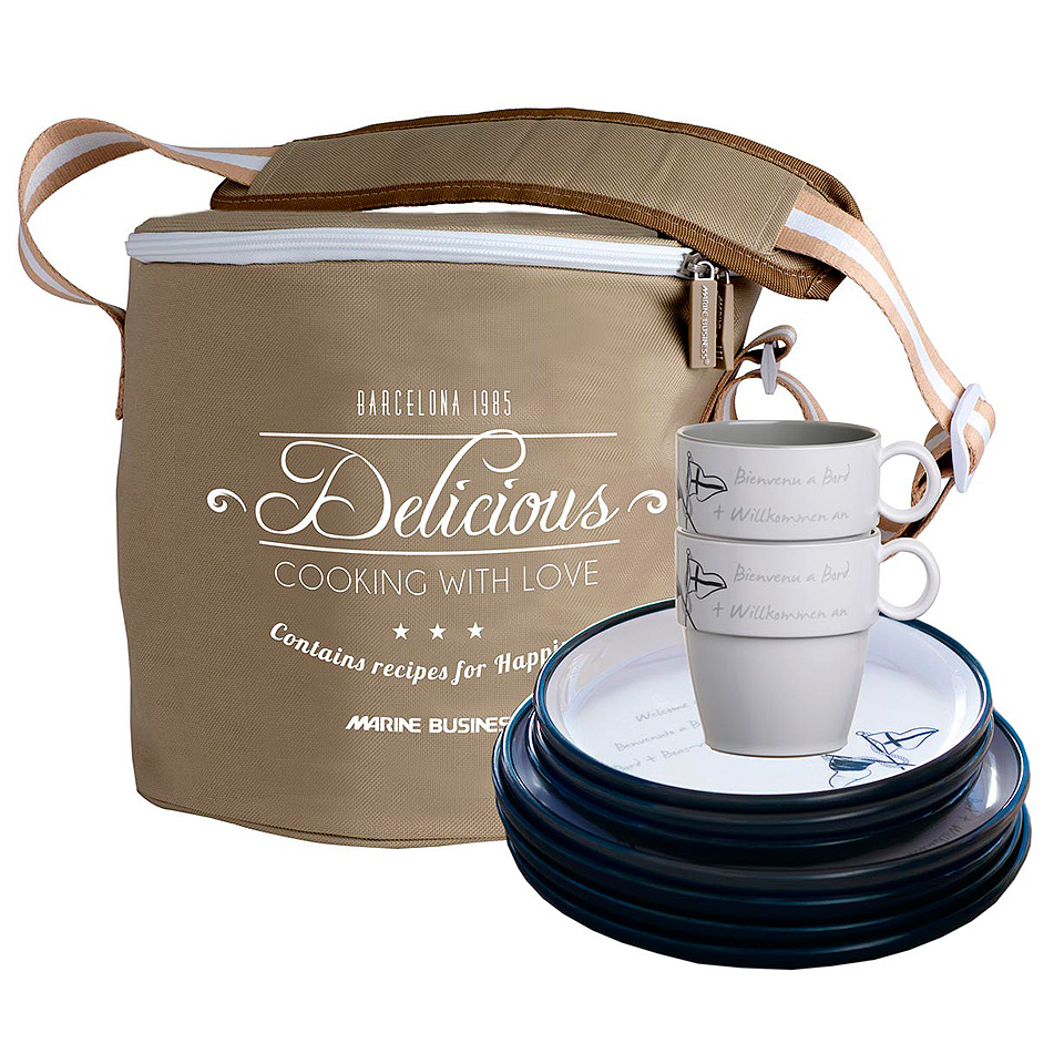 Набор посуды из меламина — стойкого к ударам и царапинам керамоподобного пластика: 4 большие плоские тарелки, 4 десертные тарелки, 4 суповые миски, 4 кружки.