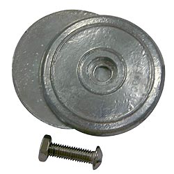 Плоский цинковый анод круглой формы. Состоит из двух половинок, скрепляемых винтом из нержавеющей стали. Применяется для защиты корпуса судна и его механизмов от электролитической коррозии. Диаметр: 70 мм.