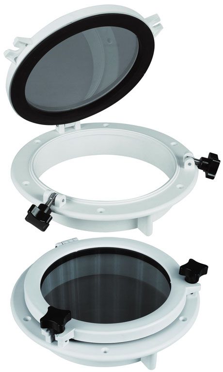 Пластиковая рама белого или черного цвета, акриловое стекло, резиновый уплотнитель. Указаны наружные размеры иллюминаторов.