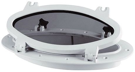 Пластиковая рама белого или черного цвета, акриловое стекло, резиновый уплотнитель. Указаны наружные размеры иллюминаторов.