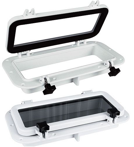 Пластиковая рама белого или черного цвета, акриловое стекло, резиновый уплотнитель. Указаны наружные размеры иллюминаторов.