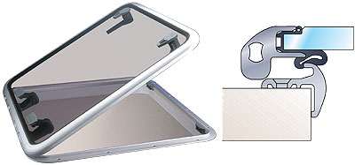 Рама из анодированного алюминиевого сплава (углы с  наружным радиусом 78 мм) и дымчатое акриловое стекло. Поставляются с фрикционным держателем крышки. Могут комплектоваться внутренней декоративной рамкой с противомоскитной сеткой, либо рамкой с противомоскитной сеткой и светонепроницаемым экраном (приобретаются отдельно). Крепятся винтами диаметром 5 мм с потайной головкой (приобретаются отдельно).