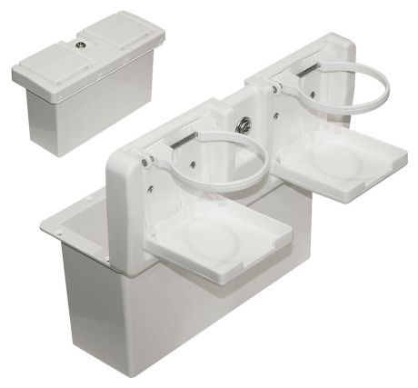 Контейнер для мелких вещей с запираемой на замок крышкой, на которой смонтированы два подстаканника.