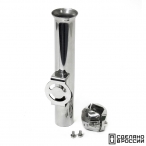 Стакан-держатель удилища из нержавеющей стали с зажимом под трубу релинга (диаметром 20-30 мм) или ролл-бара (диаметром 35-40 мм). Фланец с резиновой окантовкой для предупреждения повреждения удилища.